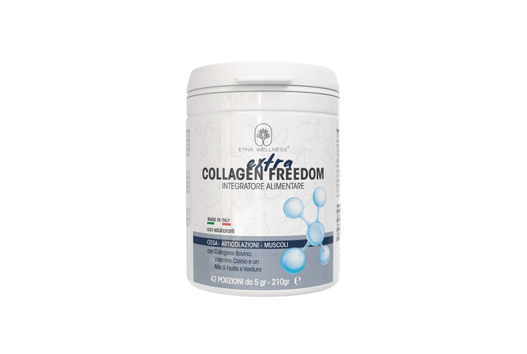 Collagen Extra Freedom è un integratore alimentare a base di collagene bovino arricchito con glucosamina, un mix di frutta e verdura, vitamine e calcio. Questo fantastico integratore è stato studiato per essere un valido alleato per la nostra salute: ci aiuta a proteggere le cellule dallo stress ossidativo, contribuisce alla normale funziona muscolare e a quella di ossa e cartilagini.